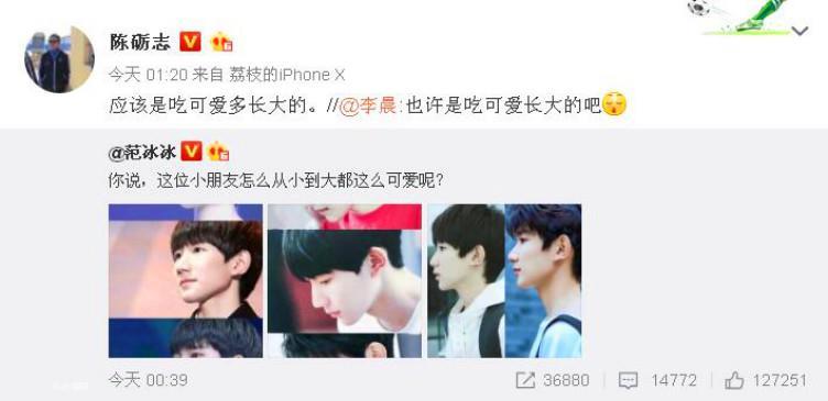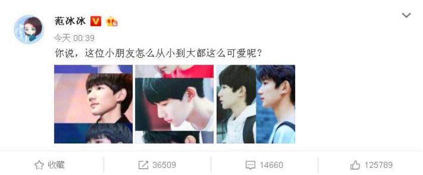 声明发出不久,范冰冰发文大赞王源从小到大都非常可爱,疑似力撑声明。