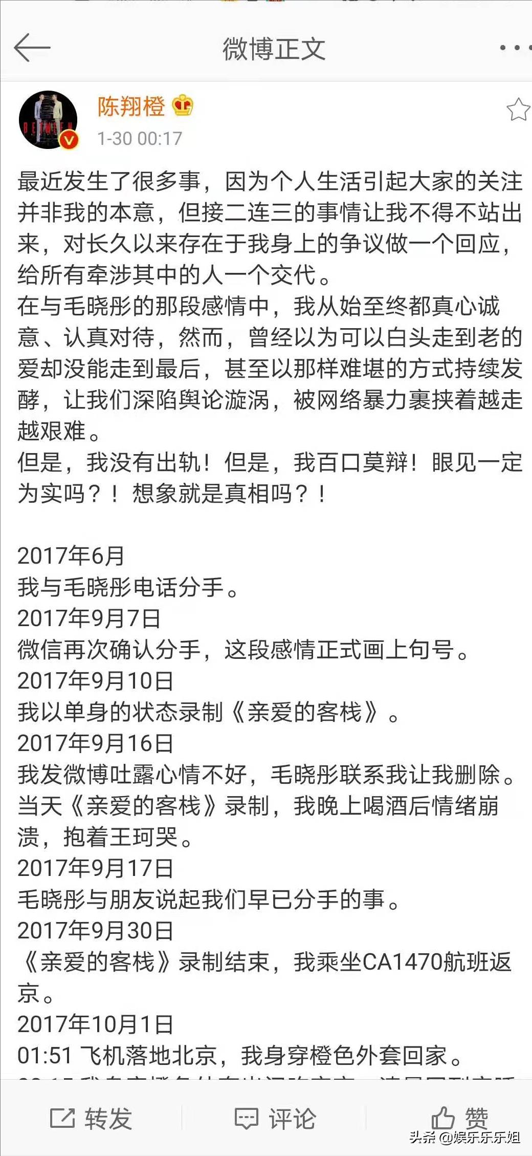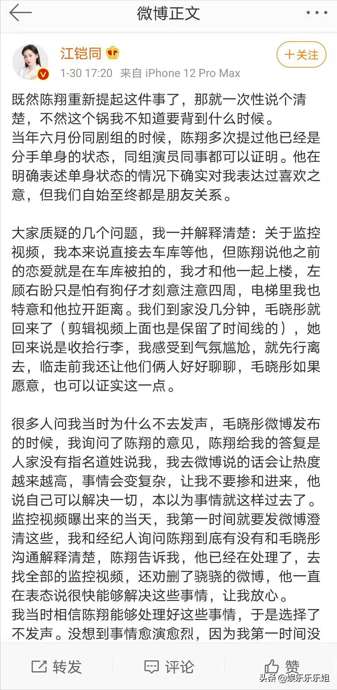 2025年初狗血的事情发生了,陈翔对之前劈腿的事情一股脑儿翻供了,称自己跟江铠同只是相约去做皮肤护理挤痘痘。自己还上演了一连串时间线来证明分手后毛晓彤才搬走的,自己背负劈腿骂名四年多,发文结尾还顺带承认了新恋情。