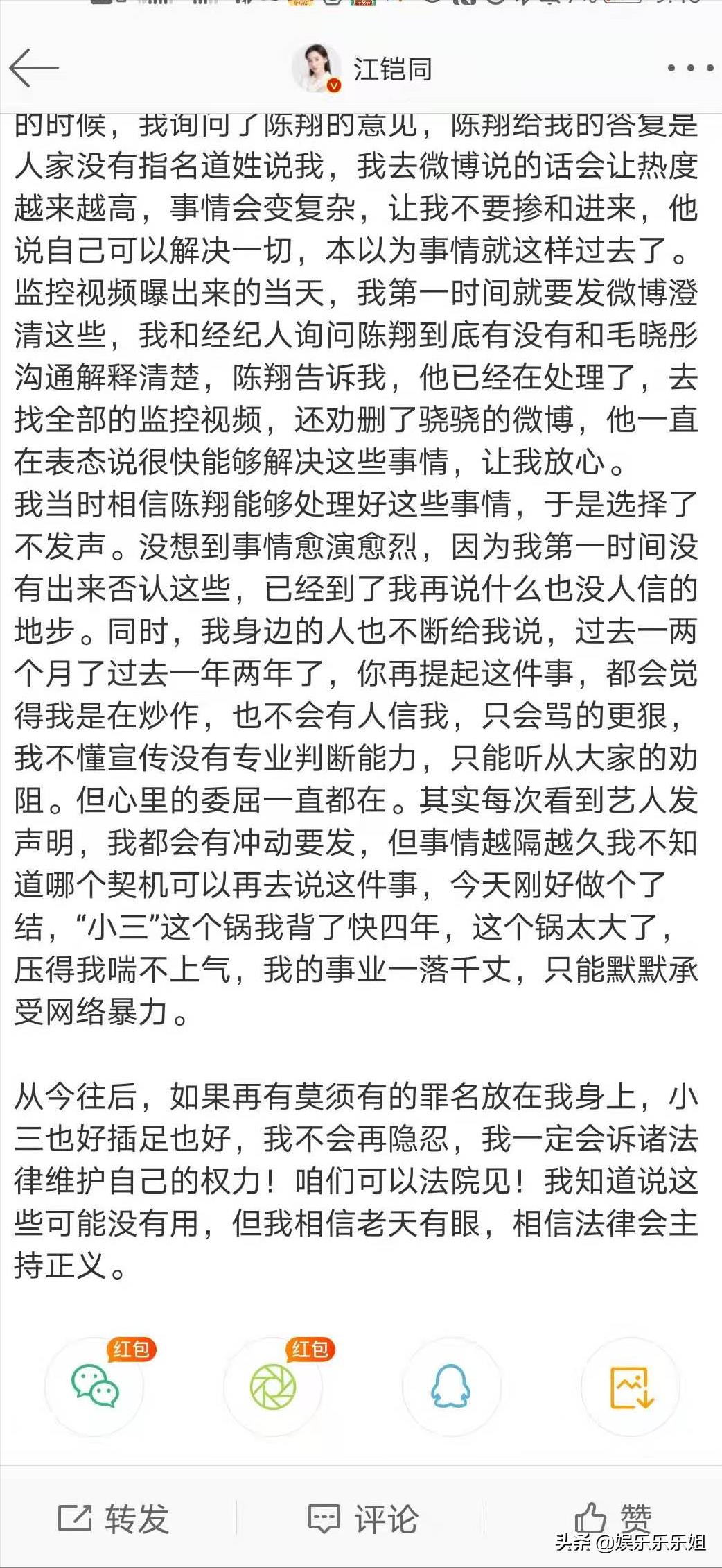 无独有偶,江铠同也发文称自己背锅四年很无辜。但是江铠同还回了一个大锅给陈翔,称陈翔6月份没跟毛晓彤分手之前就曾对她表示好感,只不过自己拒绝了。