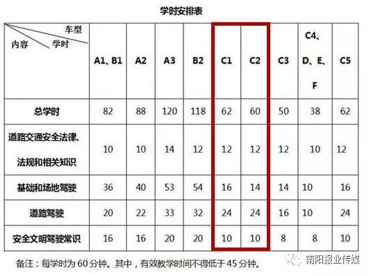 C1证的总学时为62学时,每学时为60分钟,其中有效教学时间不得低于45分钟。每个学员课堂学习时间和实际操作时间每天均不得超过4学时。