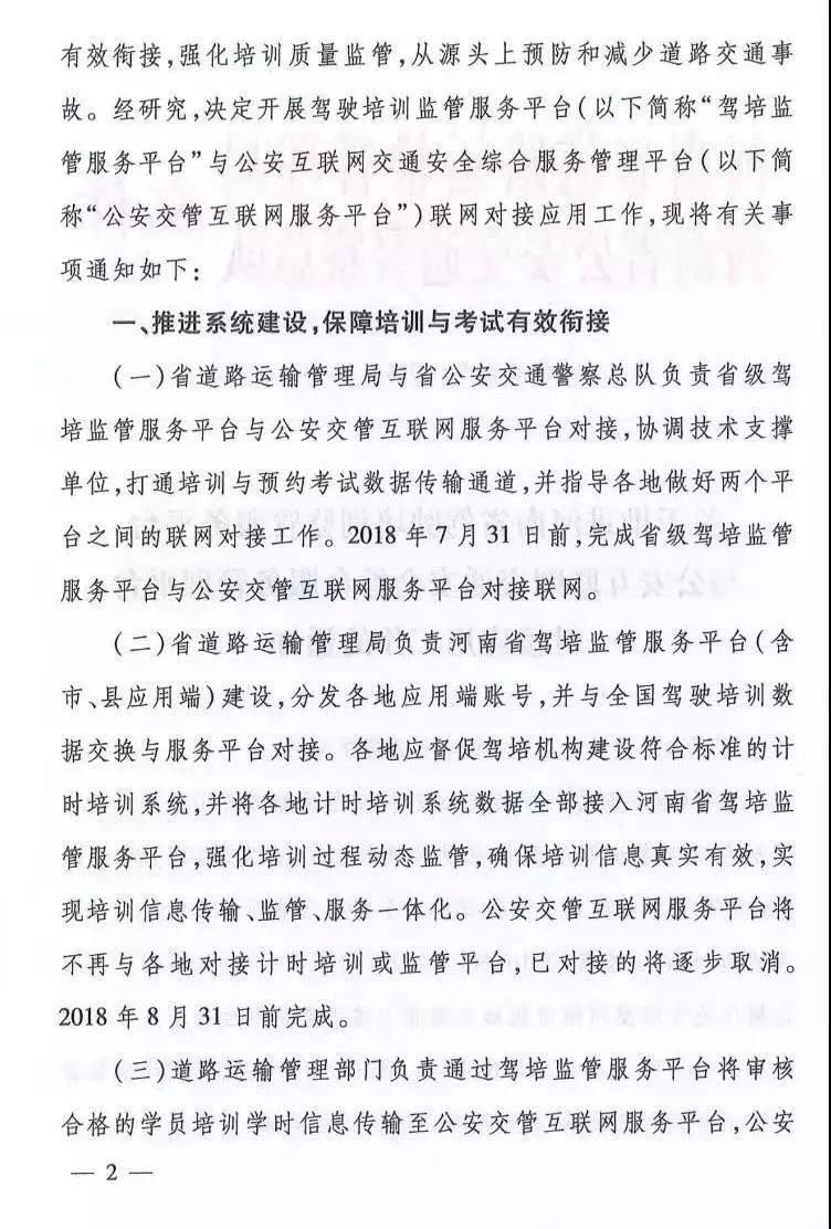 1、2018年7月31日前完成省级驾培监管服务平台与公安交管互联网服务平台对接;