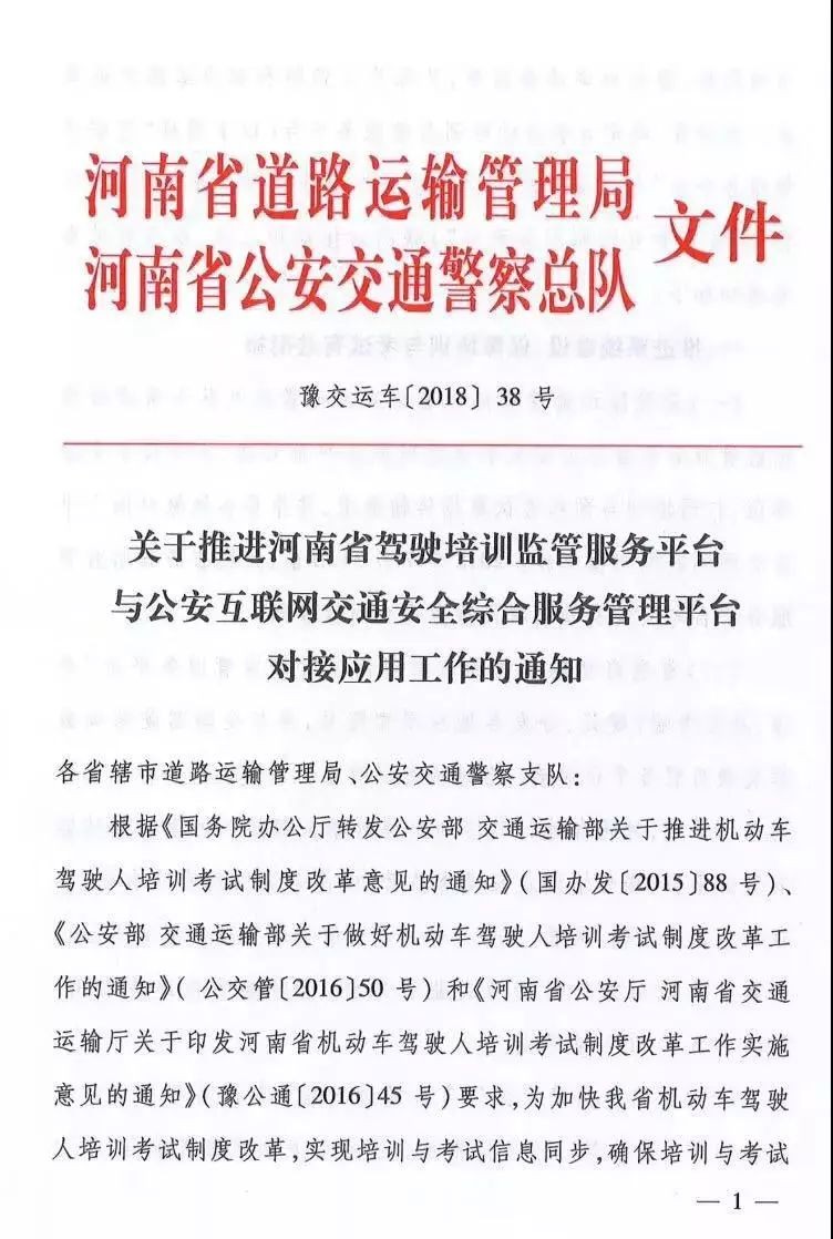 2、省道路运输管理局负责河南驾培监管服务平台(含县市应用端),分发各地应用端账号,并与全国驾驶培训数据交换与服务平台对接。2018年8月31日前完成。