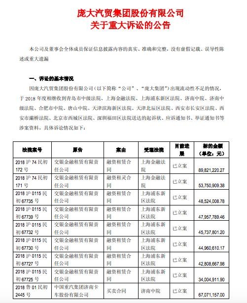 4月30日,庞大集团发布关于重大诉讼的公告称,因集团出现流动性不足的情况,于2018年度相继收到青岛市中级法院、上海金融法院、济南中院、合肥市中院、唐山中院、天津滨海新区法院、西安市长安区法院、北京市西城区法院、深圳福田区等数十家法院送达的起诉状。新京报记者注意到,涉案纠纷主要是融资租赁合同、买卖合同、借款合同,涉及金额达8亿元。