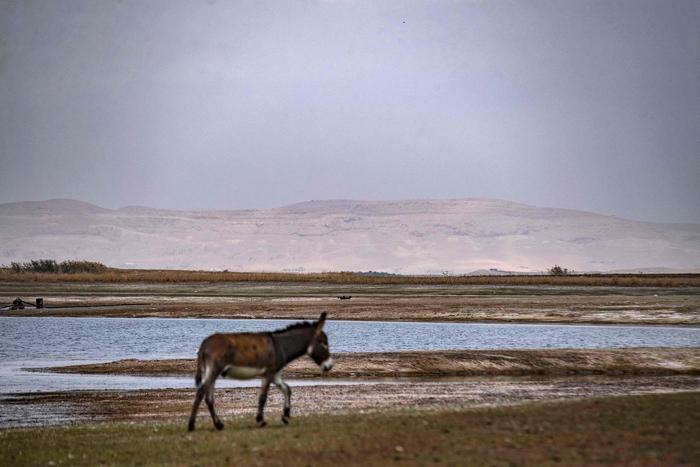 11月22日,在叙利亚塔卜卡郊区,一头驴走在水位低下的幼发拉底河边。新华社/法新