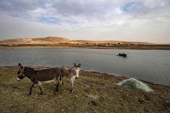 11月22日,在叙利亚塔卜卡郊区,两头驴走在水位低下的幼发拉底河边。新华社/法新