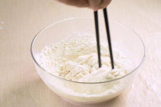 2、将面粉倒入盆中,再向面粉中加入少量的食用油以及一勺白砂糖,一边搅拌面粉一边倒入酵母粉水,直至呈现絮状为止,再用手将面揉成光滑的面团。