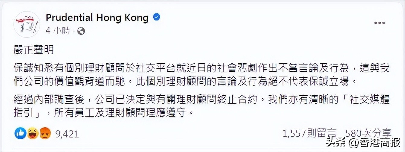今日(4日)保誠香港在其社交平台專頁發出「嚴正聲明」,指有個別理財顧問於社交平台就近日的社會悲劇作出不當言論及行為,「這與我們公司的價值觀背道而馳,此個別理財顧問的言論及行為絕不代表保誠立場。」聲明中亦有稱,「公司已決定與有關理財顧問終止合約。」不過聲明未有解釋是否與林作解除合約,仍有網民不滿留言:「唔開名都對其他理財顧問唔公平。」
