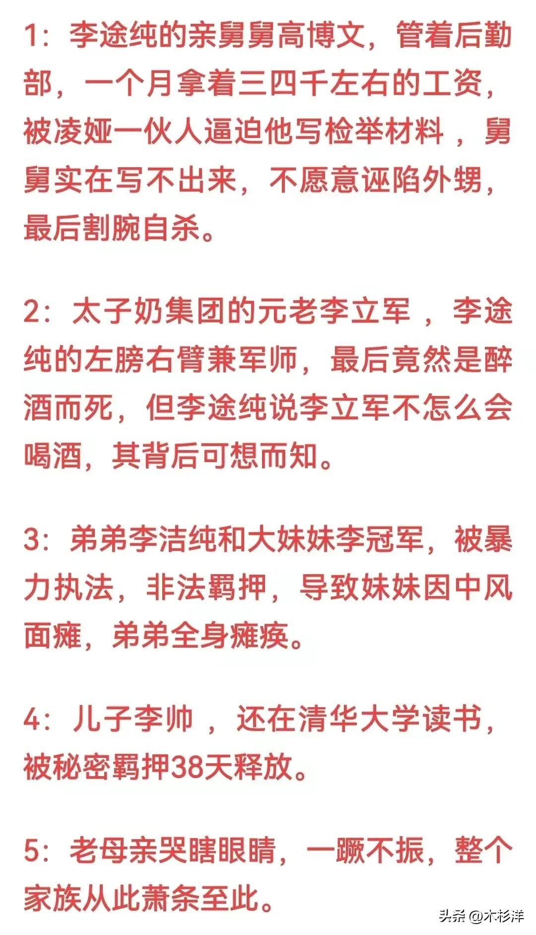 其中李途纯的舅舅割腕了断了自己;李途纯的兄弟也是太子奶集团的创始人之一被人灌酒致死;李途纯的弟弟全身瘫痪;妹妹偏瘫;李途纯公司的怀孕女员工惊吓过度意外流产。李途纯本人更是身体和心理同时遭受到了极大的伤害,