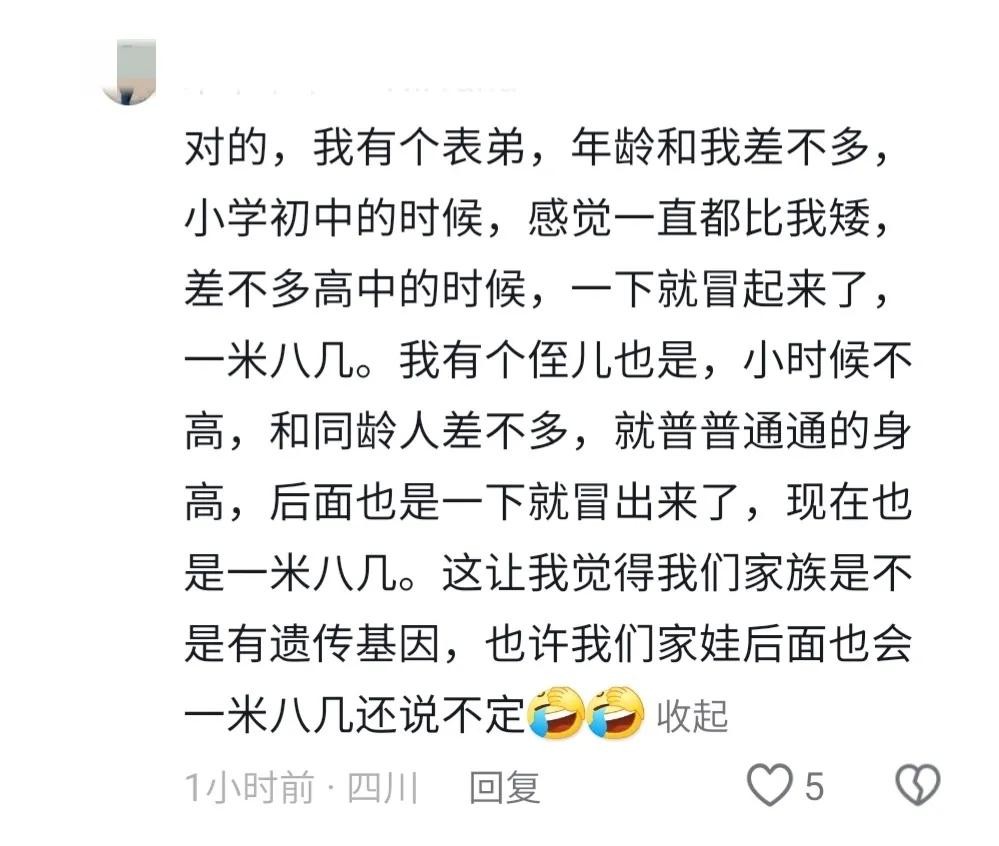 我家表弟小学初中都比我矮,结果差不多高中的时候,他一下子窜得好高。现在我变成了家里最矮的人