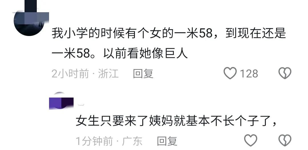 我有个女同学,小学的时候她就身高158,现在还是158,只能说岁月不饶人啊哈哈哈哈,不过小时候看她就像巨人