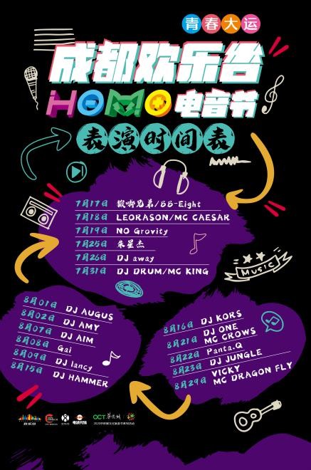 电音节期间,成都欢乐谷将与大运会组委会共同打造爱成都·迎大运"成都欢乐谷HOMO电音节大运会倒计时1周年庆典派对",展示青春积极的潮流文化,吸引年轻人群的关注并参与,助力"大运会"圆满开展!