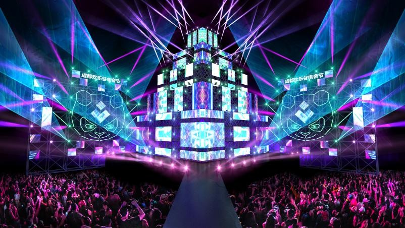 本次电音节从成都夜生活喜爱人群称号"夜猫子"一词的灵感出发,原创"夜猫先生"IP形象。全新主舞台围绕"夜猫派对"开启魔法礼盒的概念进行整体打造,氛围营造上,霸气科技灯光秀配合Y型纵深舞台和超炫LED巨幕魔盒造型,千万级视听盛宴汹涌来袭!