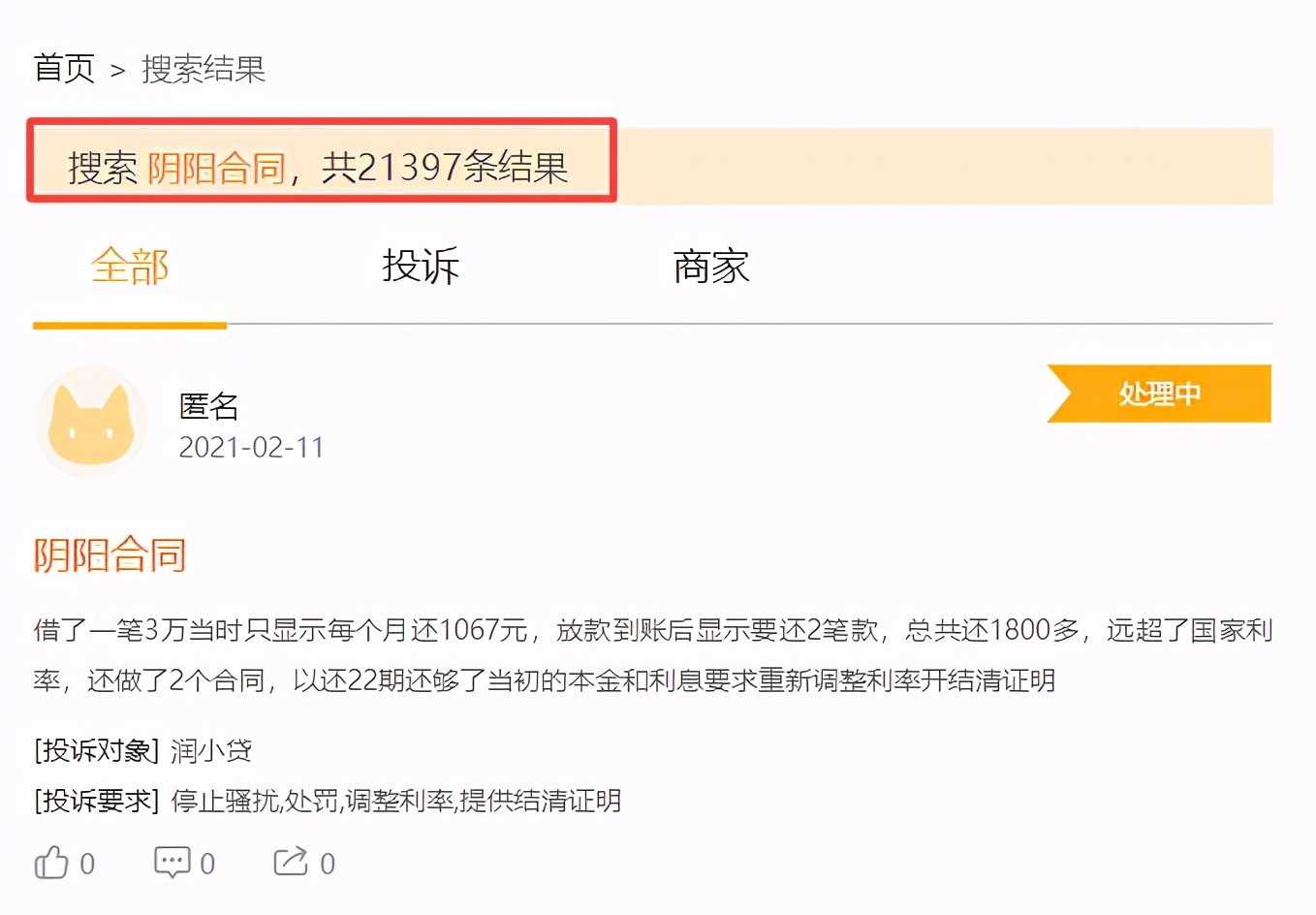 为了让大家有更加直观的感受,我们通过“黑猫投诉”来搜索“阴阳合同”关键词,发现共有21000多条记录,并且百分之八十属于网贷领域。其中反映较多的问题有: