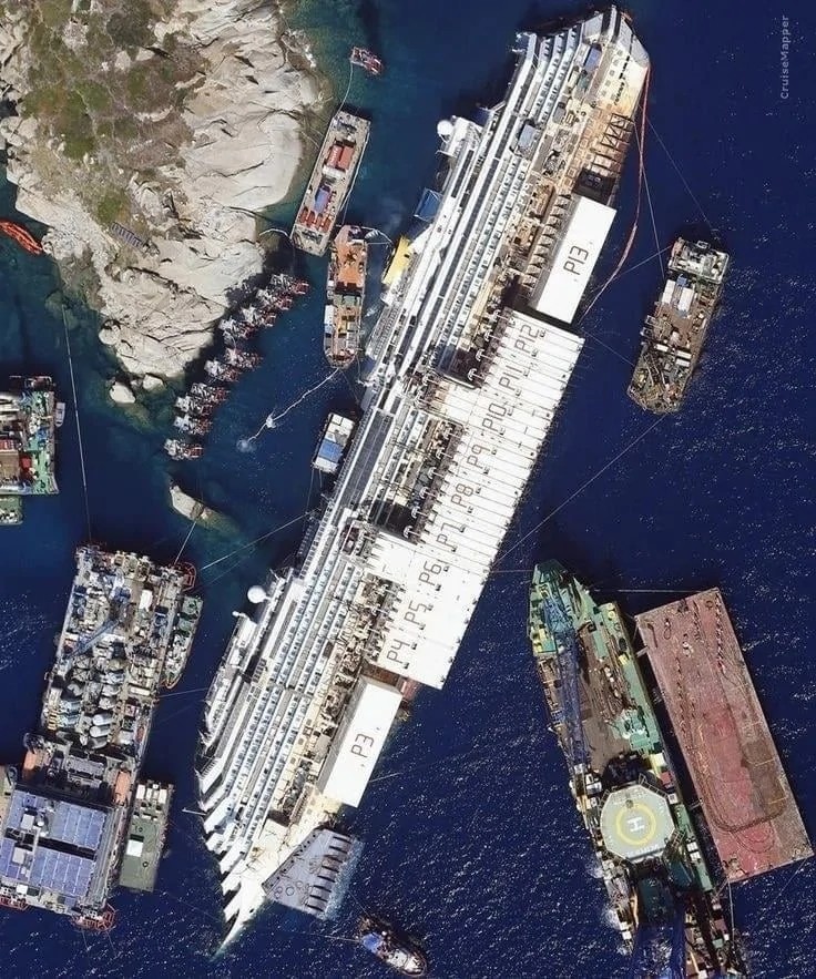 2012 年沉船后,2013 年该船被扶正。这是一个复杂的过程,包括安装巨大的水下平台,并用绳索转动船只。然后,它通过浮筒(漂浮装置)被吊到水面,并在 2014 年被拖到热那亚进行拆解。这次行动需要精心策划,数百名工程师和潜水员参与其中,成为了海上救援的空前壮举。