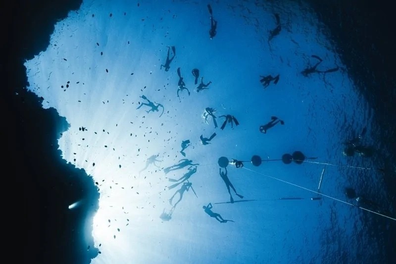 达哈卜公开赛,从下方视角。运动员开始下潜,而团队在水面上等待。