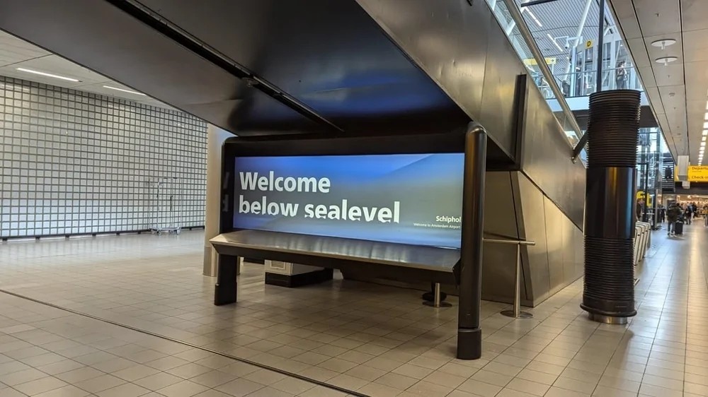 迎接阿姆斯特丹机场乘客的标志:欢迎来到海平面以下。