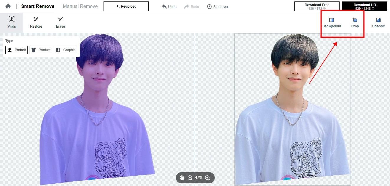 第二步,图片导入后点击右下角的【start】按钮,网页会自动识别主体并抠出。