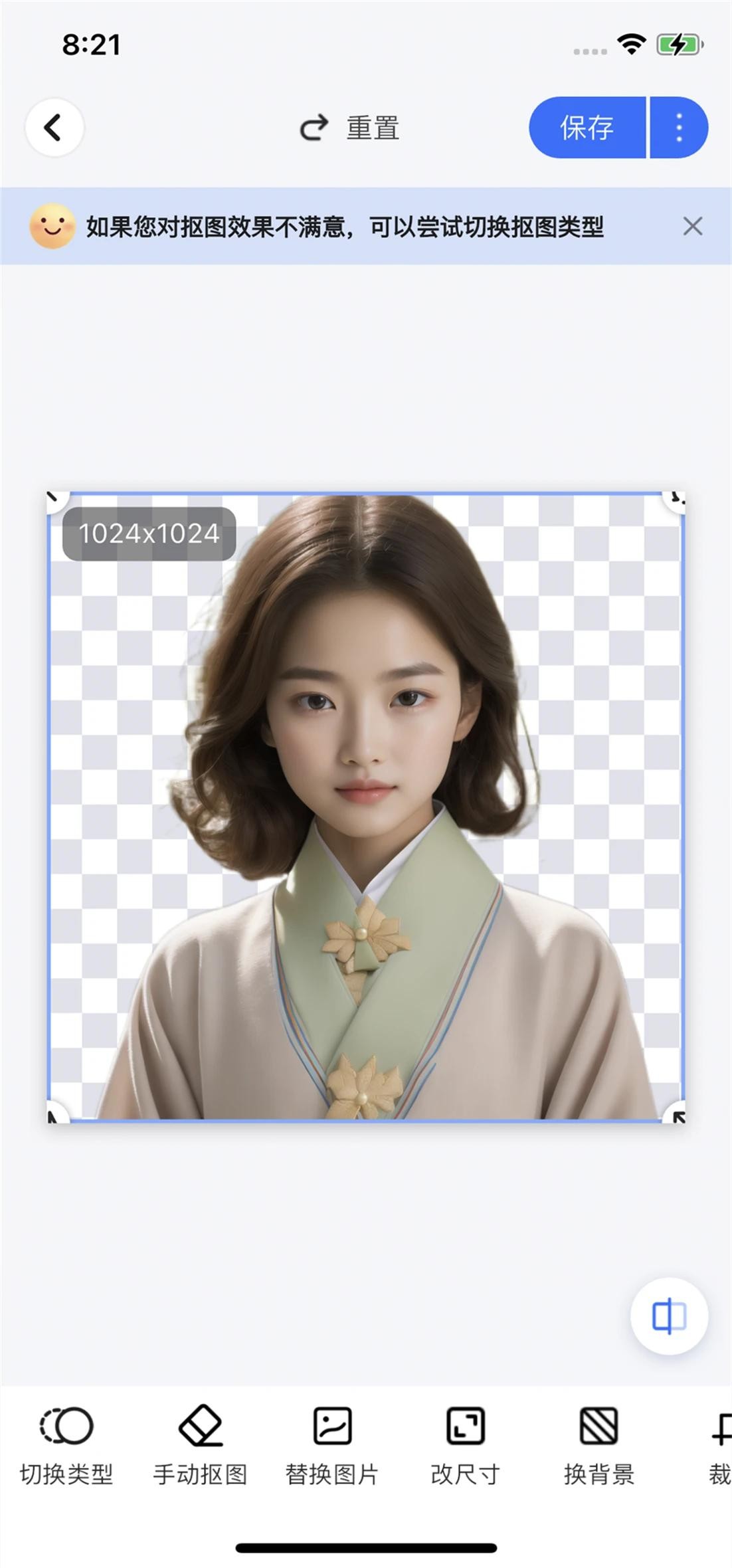 第二步,图片导入后会自动识别主体并抠出,完成后可以在界面中预览到抠图效果,可以手动在做调整或直接保存使用。