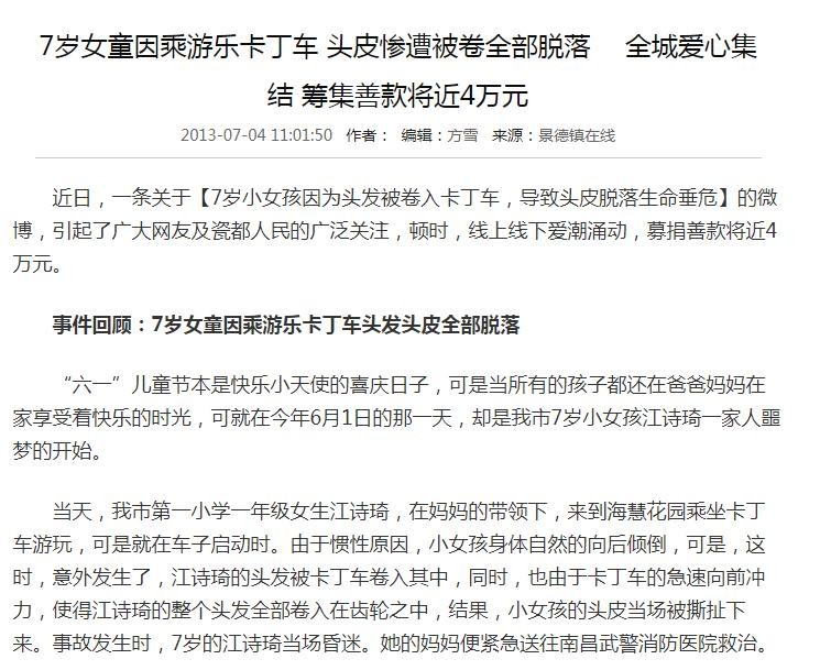 一名7岁女童因乘游乐卡丁车