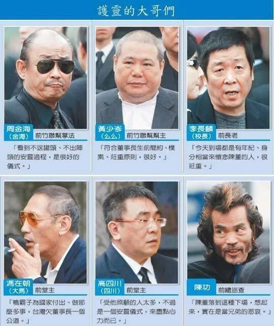参加祭奠的人数超过2万,几乎包括所有台湾黑道帮派的领导人和大佬辈,还有各党派代表,政府高层,社会各界名流等。