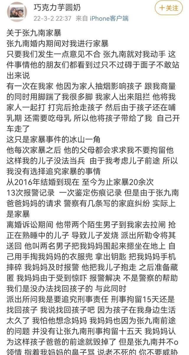 出轨+家暴?德云社张九南遭妻子指控,究竟谁的错?近日,德云社张九南妻子在社交平台发布长文,说张九南在婚内期间对其进行家暴。从2016年结婚到如今,家暴20多次,13次报警记录,一次伤痕鉴定记录。张九南妻子虽然多次遭受家暴,但是考虑到孩子还小,而张九南的父母还从中求情,所以每次都选择忍气吞声。但是张九南却并不领情,依旧我行我素。看过《不许和陌生人说话》的朋友,一定对剧中冯远征饰演的角色有心理阴影,但那是电视剧,现实生活中也有不少明星家庭存在各种程度的家暴现象。