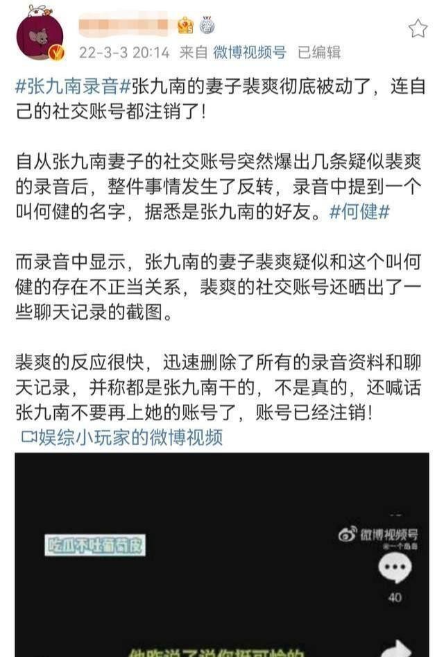 但过了一天,剧情直接发生了反转,在昨天早上,张九南妻子的社交平台放出了多段录音,当中的信息量巨大,全程长达30多分钟,更是自爆自己出轨的很多细节,这也是令不少人感到意外,同时,在聊天过程中更是提到了一个名叫何建的人,据悉,他是张九南的发小(在这里说明一下,并不是德云社的何建,二人只是同名而已),不仅如此,这个何建也是已婚人士,甚至在录音中张九南妻子还直接透露已经为自己出轨想好了对策。