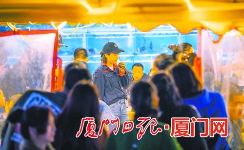 另一位“抖音王”花姐,自称“大排档业余歌手”。早在快手App上,她就凭一首《等一分钟》火爆一时,拥有超过414万粉丝。而她的抖音号粉丝数也达到了554万。20日20时许,记者在明发商业广场的一个大排档找到了她。大排档外围满了路人,纷纷拿着手机在拍。“我从沈阳来厦门出差,听说花姐在这儿,特意过来看。”路人刘先生直言。不过,他并不知道花姐在快手App上的名气。
