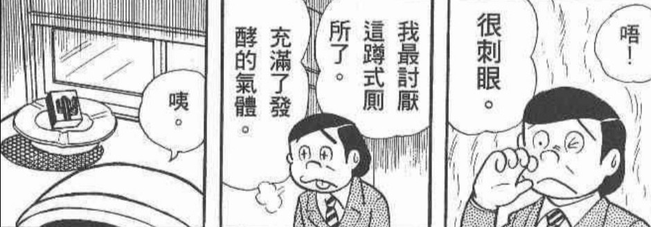 百般无奈的村西借用了洗手间,想在里面放松放松,却闻到了很重的烟味,原来在厕所边上放着一包香烟,应该是女主人为漫画家准备的。