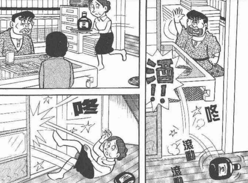 两人刚一入座,因为瓶子里没有酒,漫画家就怒气冲冲地将酒瓶甩出房门,老婆像机器人一样将瓶子捡了进去,这个举动惹怒了漫画家,差点又是一顿痛扁。