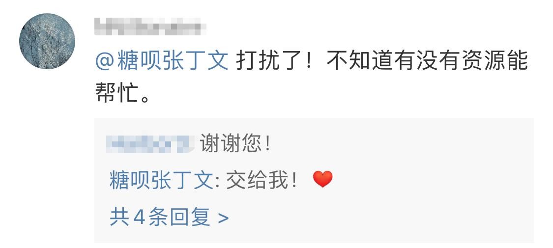 新京报讯(记者 周依)这几天,微博网友“糖呗张丁文”火了。在多条新冠肺炎患者求助信息微博评论区,都能看到他的那句回复——“交给我”,配以一个“爱心”表情。