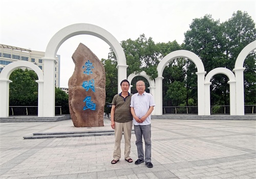 3、崇明岛是中国第三大岛,位于上海市北部长江口,大部属上海市崇明区,是长江三角洲东端长江口处的冲积岛屿,成陆历史有1300多年,被誉为“长江门户、东海瀛洲”,东西长76公里,南北宽13~18公里,形状狭长如卧蚕,2010年全岛面积1269平方千米。与妻二弟合影。摄于2023年6月22日。