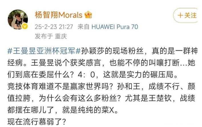 某歌手怒批孙颖莎粉丝:委屈什么?4比0这就是实力的碾压局