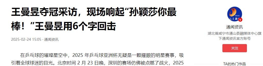 通闻资讯《王曼昱夺冠采访,现场响起“孙颖莎你最棒!”王曼昱用6个字回击》