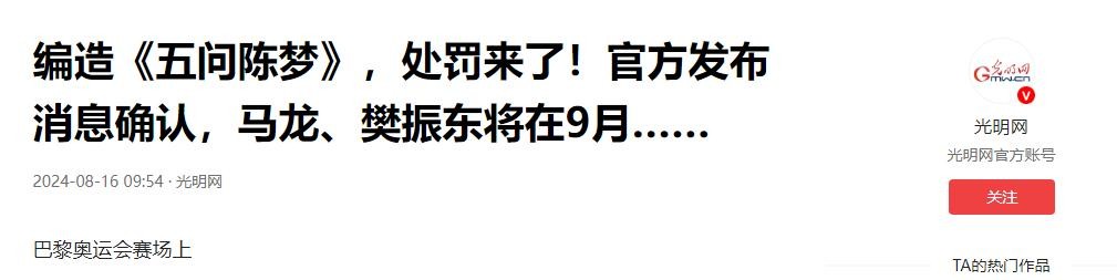 光明网《编造《五问陈梦》,处罚来了!官方发布消息确认,马龙、樊振东将在9月……》