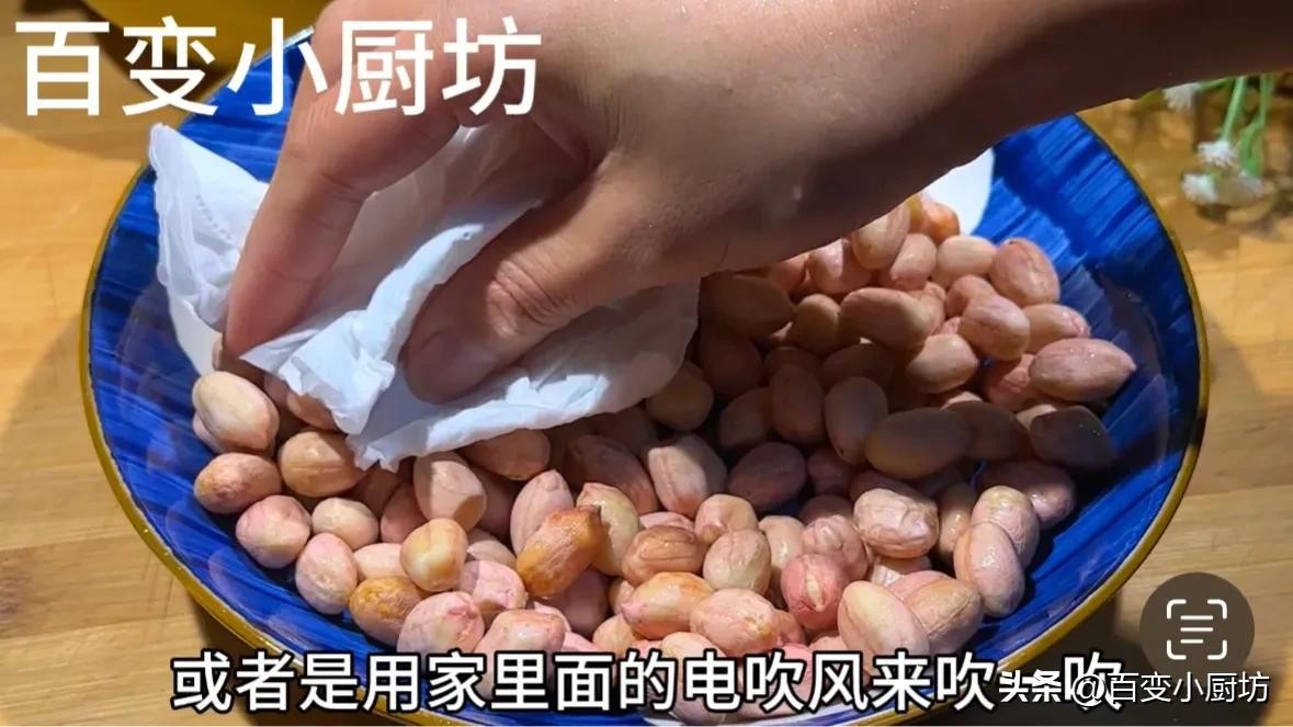 但如果比较赶时间的话,也可以和我一样,用纸巾将表面的水分擦一擦,或者是用家里面的点吹风来吹一吹,像这样我们的花生米表面的水分就已经完全干了。