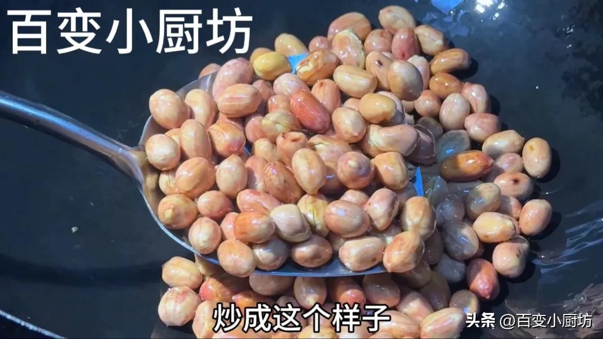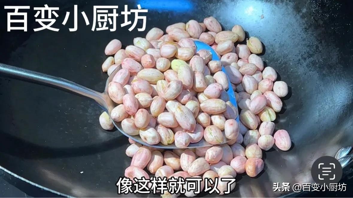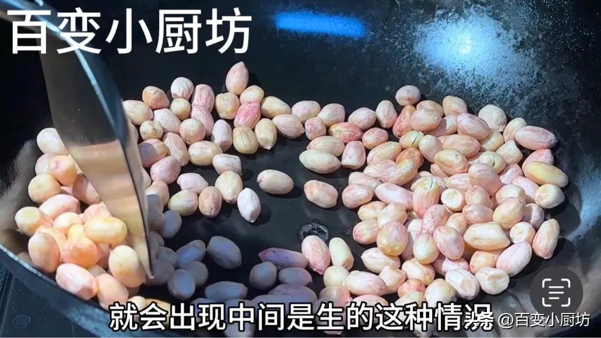 除此之外,站在锅边还能闻到特别浓郁的炒花生的香气,像这个样子,咱们的花生就已经炒到八九成熟了。
