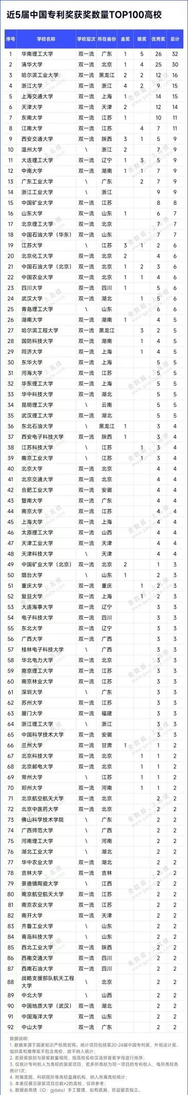 在近5届中国专利奖获奖数量统计排名中,华南理工大学以32项总奖项,排名清华大学、哈尔滨工业大学、浙江大学、上海交通大学等诸名校之前,高居全国高校排名第一名!