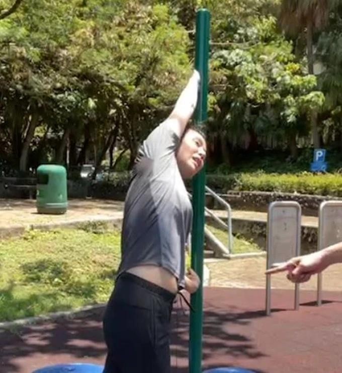 显然也是注意到了镜头前的赘肉问题,蒙嘉慧不好意思地拉扯上衣,只是短小修身款的确没有多少修身效果。单纯就四肢来看,蒙嘉慧身材还是很匀称纤细的,只是即使没有生娃,肚腩依旧是个问题。