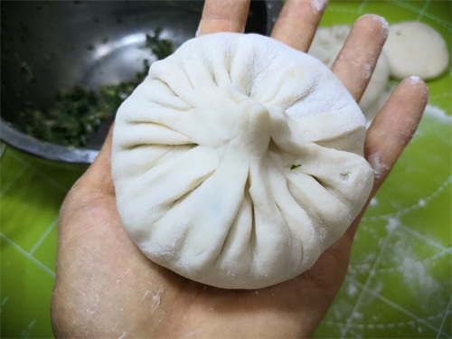 8、把面团取出,揪吃大小合适的剂子,擀成皮,包裹上馅料。