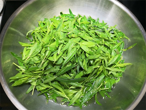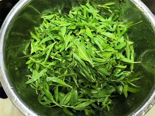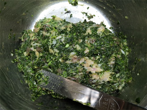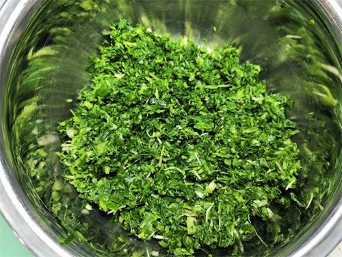 3、捞出过凉水,沥干水分,切碎,拧出水分,备用。