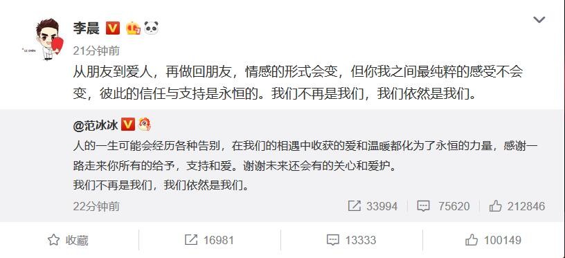 仅相差一分钟,李晨转发了范冰冰的微博,并写道: