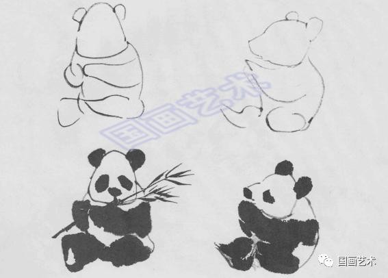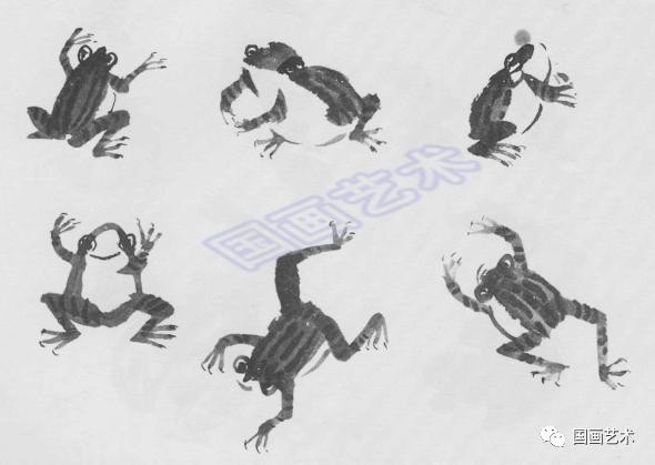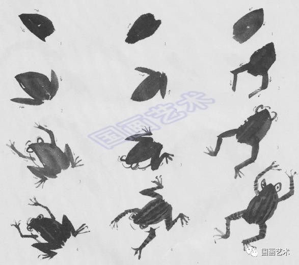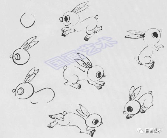 中锋淡墨画头、耳、身躯;画出四肢,染出眼;画出不同动态。