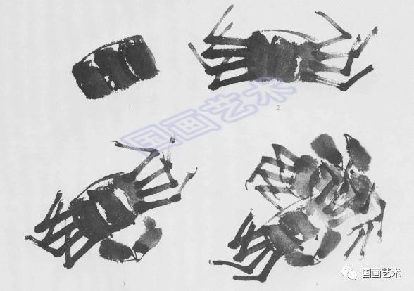 1、笔尖蘸浓墨、侧锋行笔;2、中锋行笔;3、头部,侧锋点画,中锋画出嘴、趾;4.不同动态。