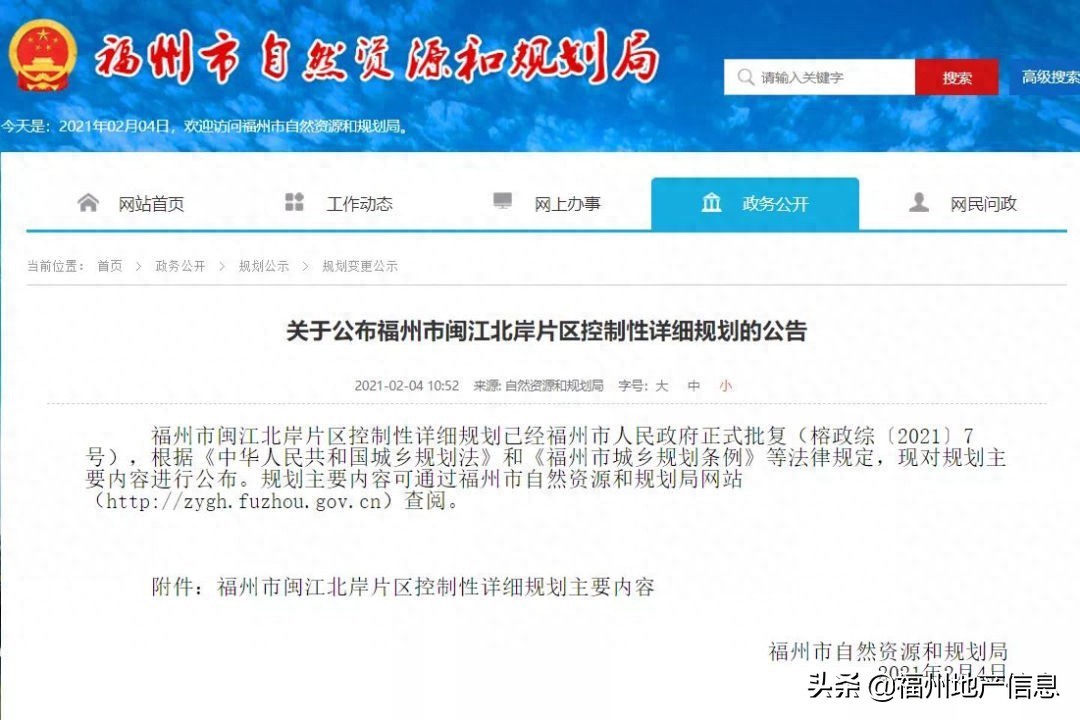 2月4日,福州市自然资源和规划局官网发布“关于公布福州市闽江北岸片区控制性详细规划的公告”: