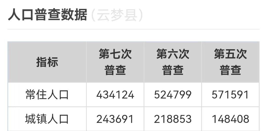根据2020年全国第七次人口普查统计结果,云梦县常住人口434124人,其中:城镇常住人口243691人。