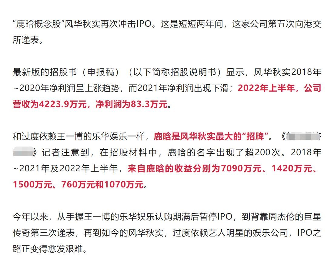 而此前鹿晗背后的公司风华秋实谋求上市,招股材料曝光了鹿晗收入,材料中写道,2018年-2021年及2022年上半年,来自鹿晗的收益分别为7090万元、1420万元、1500万元、760万元和1070万元。需要注意的是,这里的“收益”并非公司和艺人分成后的纯利润,而是实实在在来自艺人的收入,因为招股说明书中明确指出,2022年上半年,公司营收为4223.9万元,其中包含来自鹿晗的1070万元收益,但净利润仅为83.3万元,这相当于和艺人分成、扣除税费及公司运营、宣传等各项费用后,剩下的净利润才80多万。