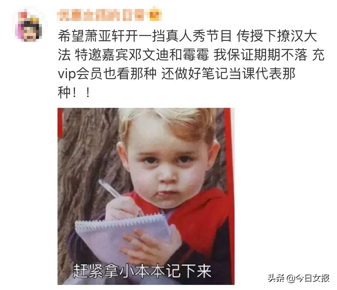 看了这个酷似“亚洲男子偶像天团”的前男友阵容,广大单身网友纷纷表示了对萧亚轩的膜拜,并劝她开个节目,可以请邓文迪或者泰勒做嘉宾,保证一期不落的看,保证立马充会员。