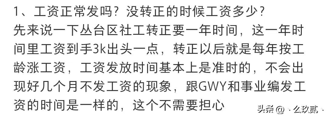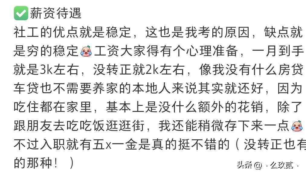 3.薪资待遇:社工的优点就是稳定,这也是我考的原因,缺点就是穷的稳定工资大家得有个心理准备,一月到手就是3k左右,没转正就2k左右,像我没有什么房贷车贷也不需要养家的本地人来说其实就还好,因为吃住都在家里,基本上是没什么额外的花销,除了跟朋友去吃吃饭逛逛街,我还能稍微存下来一点不过入职就有五x一金是真的挺不错的(没转正也有的那种!)