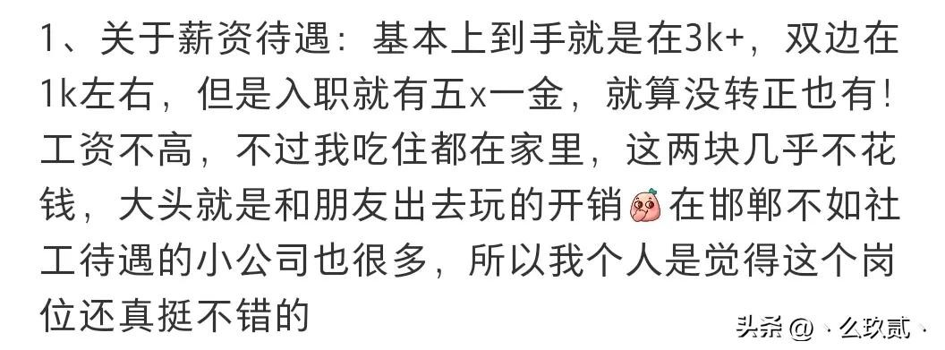 6.关于薪资待遇:基本上到手就是在3k+,双边在1k左右,但是入职就有五x一金,就算没转正也有!工资不高,不过我吃住都在家里,这两块几乎不花钱,大头就是和朋友出去玩的开销在邯郸不如社 工待遇的小公司也很多,所以我个人是觉得这个岗位还真挺不错的