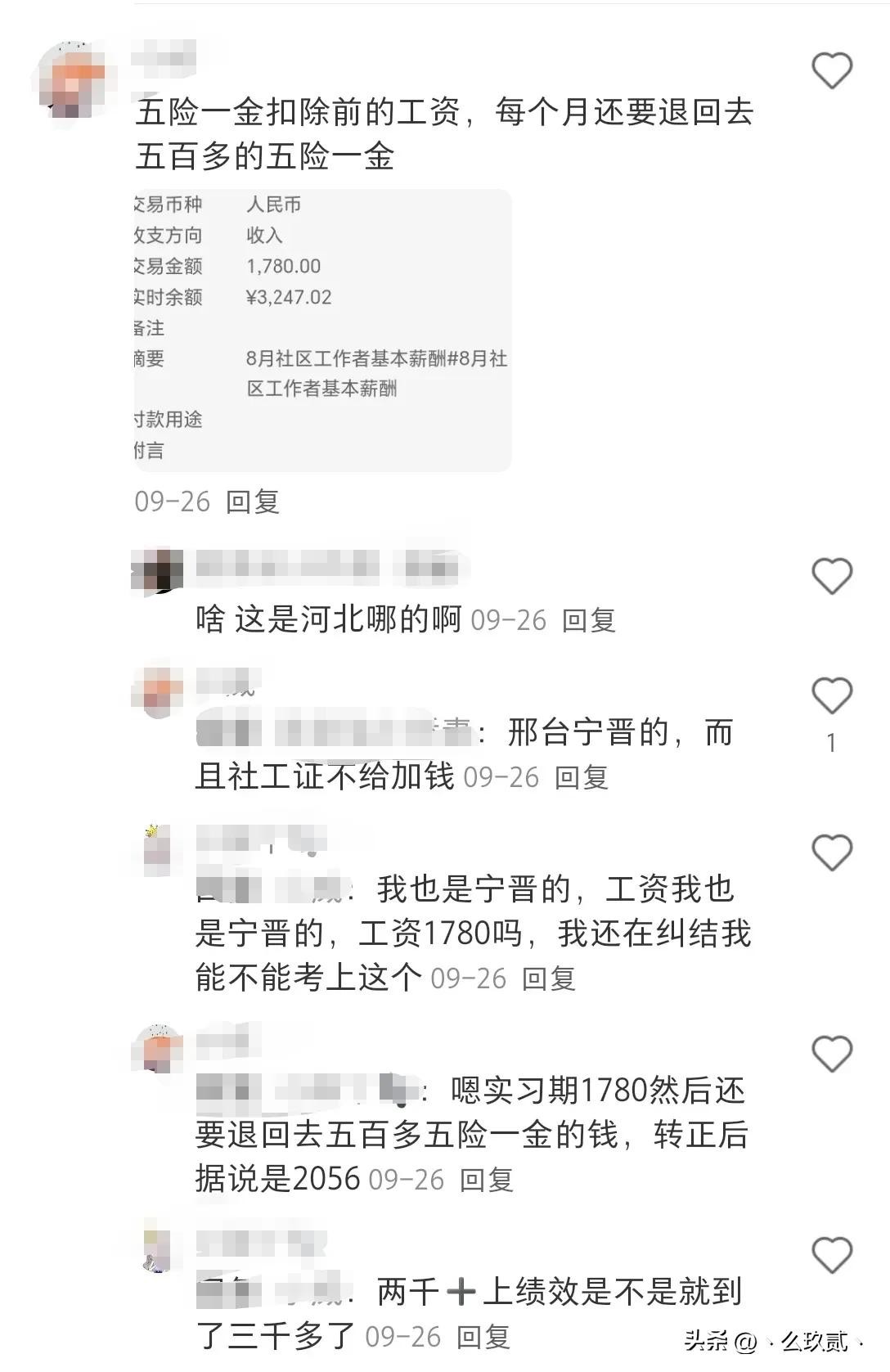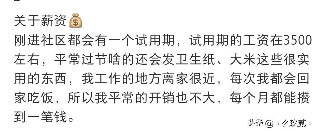 2.关于薪资:刚进社区都会有一个试用期,试用期的工资在3500左右,平常过节啥的还会发卫生纸、大米这些很实用的东西,我工作的地方离家很近,每次我都会回家吃饭,所以我平常的开销也不大,每个月都能攒到一笔钱。